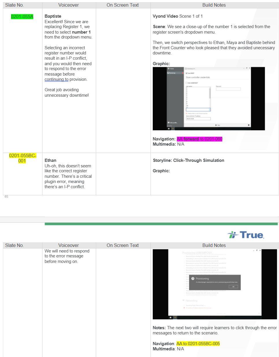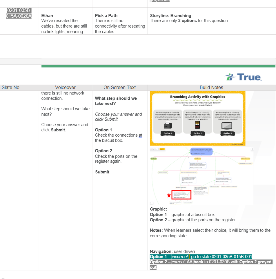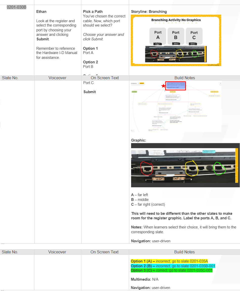 Because this was the organization’s first branching-style module, I established a new internal standard for documenting branching logic. I introduced a color-coded, alphanumeric slate system to distinguish correct, incorrect, and recovery paths, and to direct navigation between decision points and consequences. This structure helped the development team quickly understand how learner choices flowed through the experience, reducing confusion during the build.