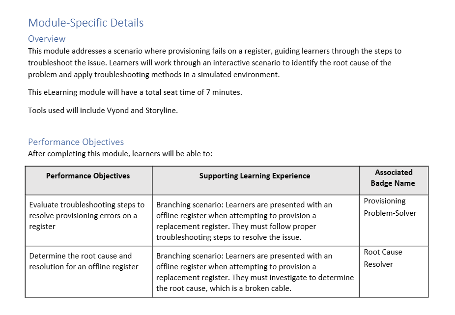This project established a new approach to scenario-based learning within the organization, introducing branching-style design and new documentation standards to support complex troubleshooting training. Through close SME collaboration, intentional design decisions, and clear communication with cross-functional partners, the module delivered a realistic, performance-focused learning experience.