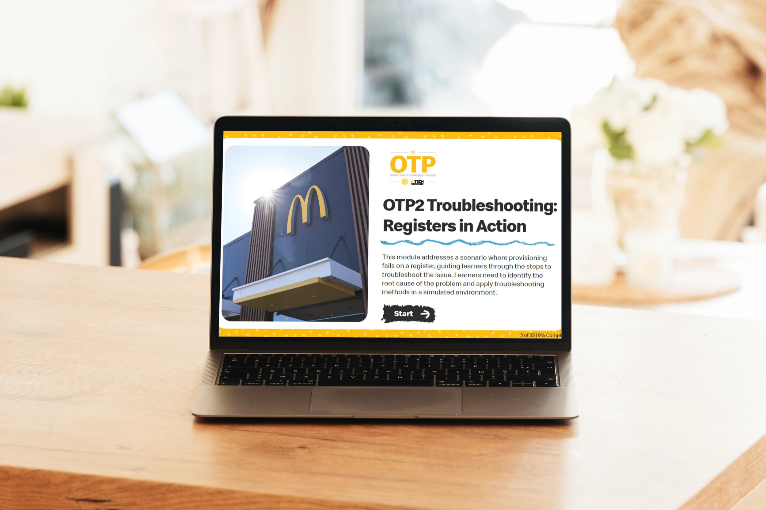This performance-based eLearning module is part of a course for restaurant technology employees. Learners navigate a branching troubleshooting scenario that simulates real-world technical issues encountered in restaurant environments.